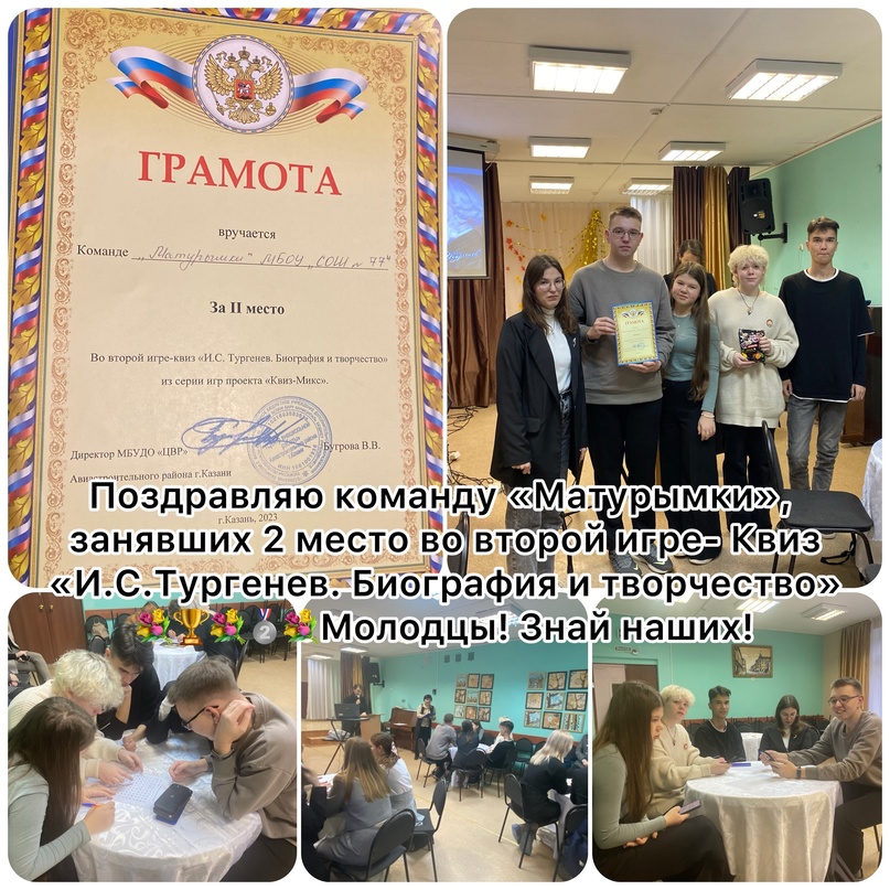 16.11.2023г. на базе ЦВР Авиастроительного района г.Казани состоялась 2 игра - Квиз «И.С.Тургенев. Биография и творчество» из серии игр проекта «Квиз- Микс» и наша команда 11 классников «Матурымки» заняли 2 место.