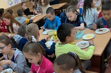 Мы за столиком сидим вкусный завтрак мы едим. Постарались повара, приготовили с утра нам омлет и запеканки. Кашу вкусную из манки. И конечно молочка, целых два стаканчика. Завтрак быстро уплетём, на занятия пойдем. Но сначала мы конечно, всю посуду уберём. 01.06.2021
