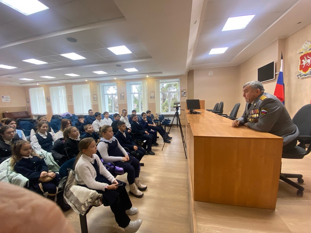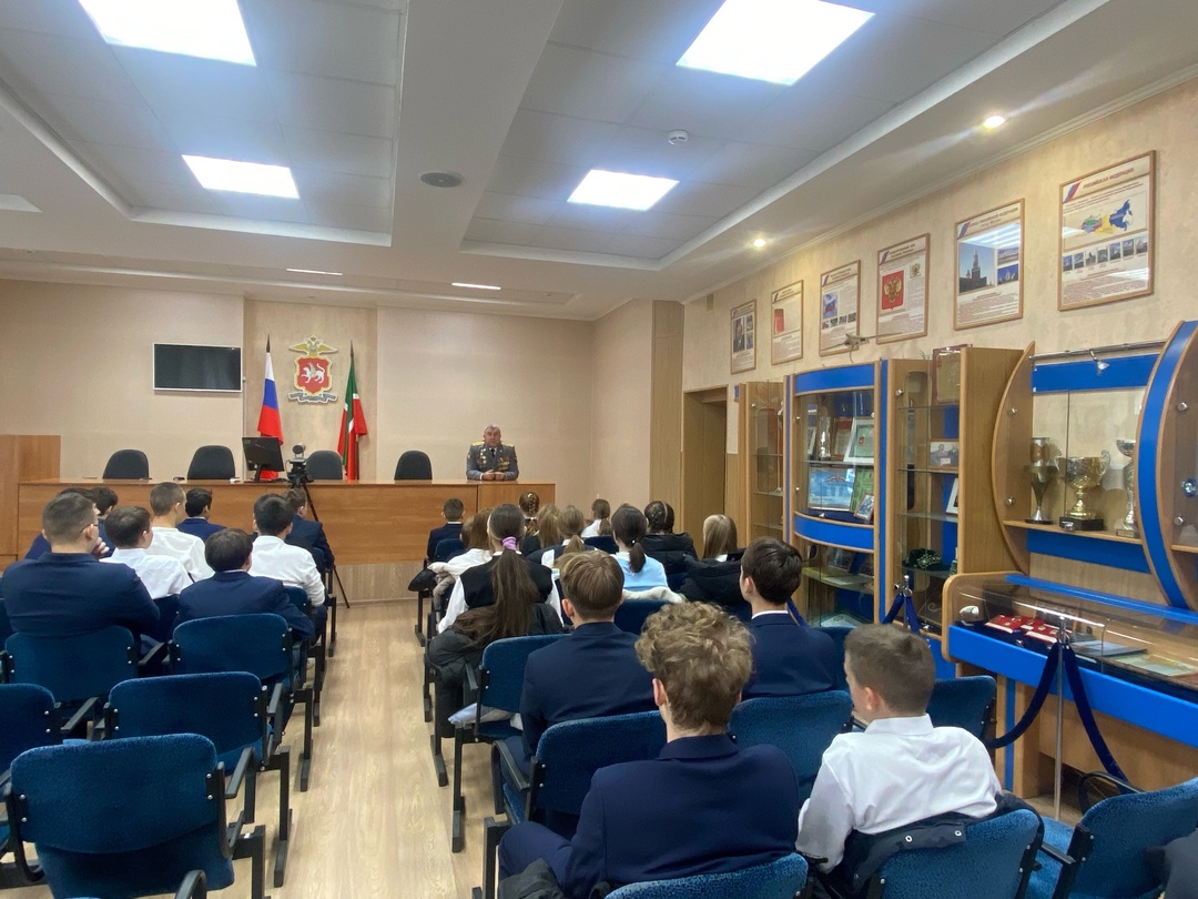 Перед ребятами выступил Сафин Талгат Фоатович, подполковник милиции в отставке и председатель Совета ветеранов отдела полиции Авиастроительного района г. Казани. Он рассказал ребятам историю становления советской милиции, затем полиции, о тяжёлых буднях в годы войны, в 90-е годы… О героическом подвиге милиции/ полиции в боях Афганистана, Чечни и на СВО.