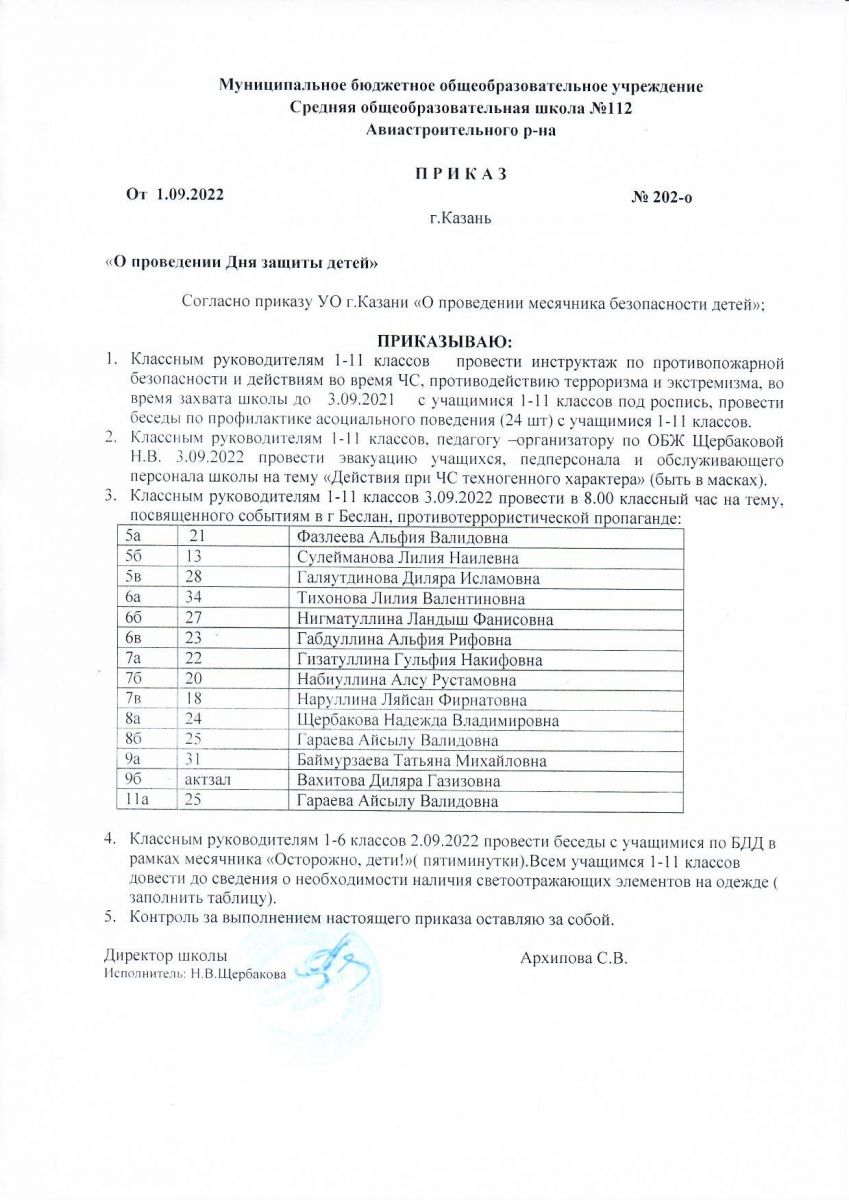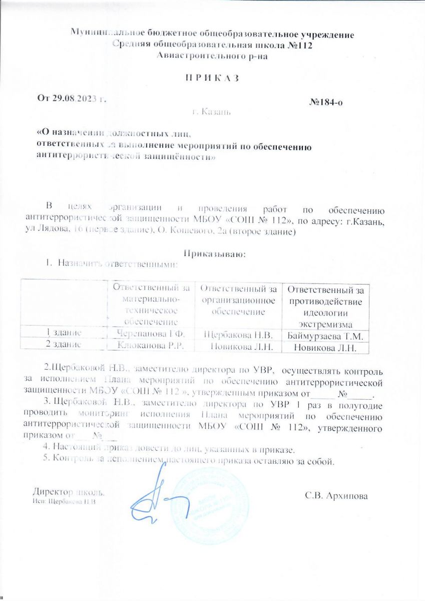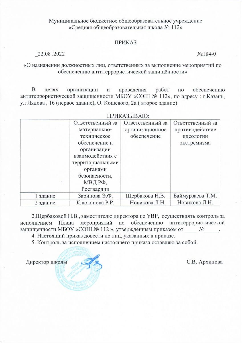 Приказ о назначении должностных лиц по антитеррористической работе в 2022\2023 учебном году