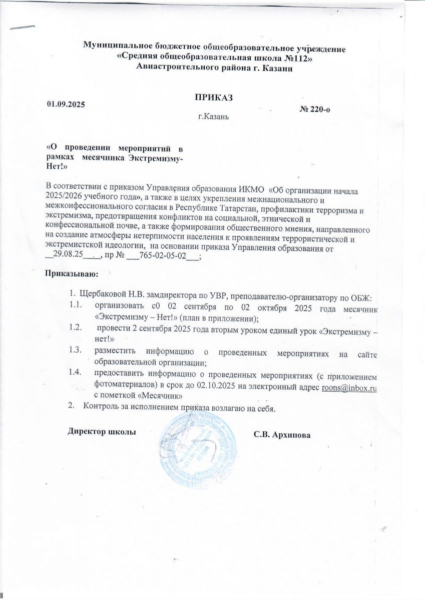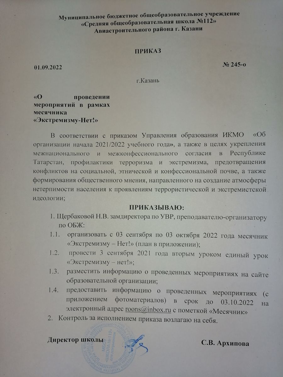 Приказ о проведении мероприятий в рамках месячника "Экстремизму - нет!" № 249-о от 1.09.22г.
