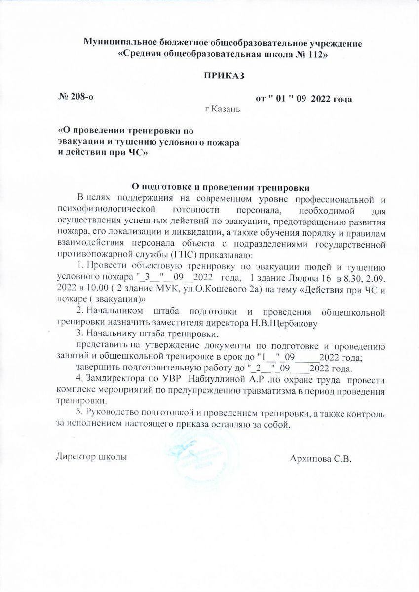 Приказ о проведении объектовой тренировке в 2022\2023 учебном году