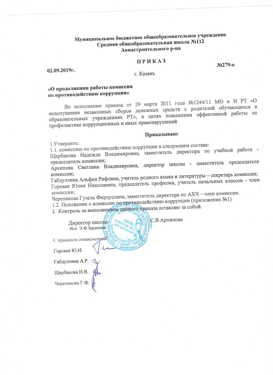 Приказ о продолжении работы комиссии по противодействию коррупции 2019/2020 г.