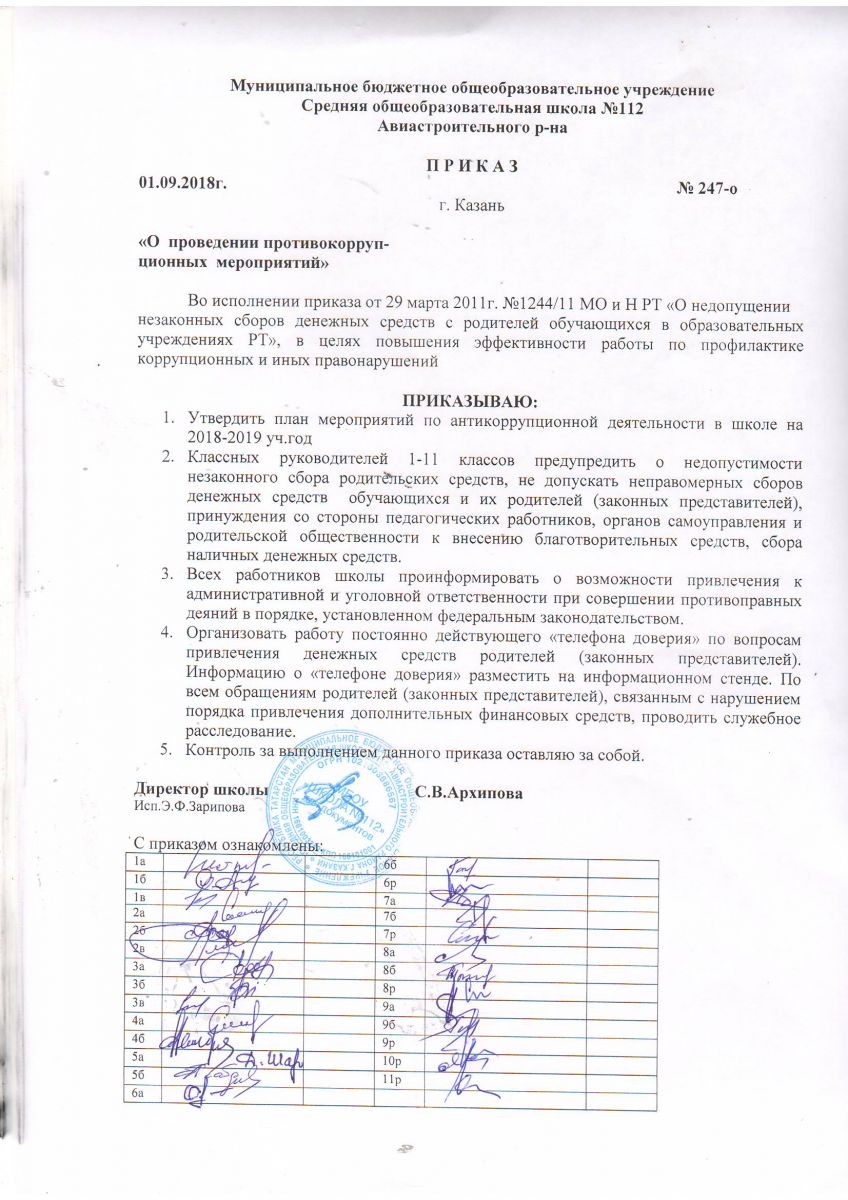 Приказ по профилактике антикоррупционных проявлений от 1.09.2018г.