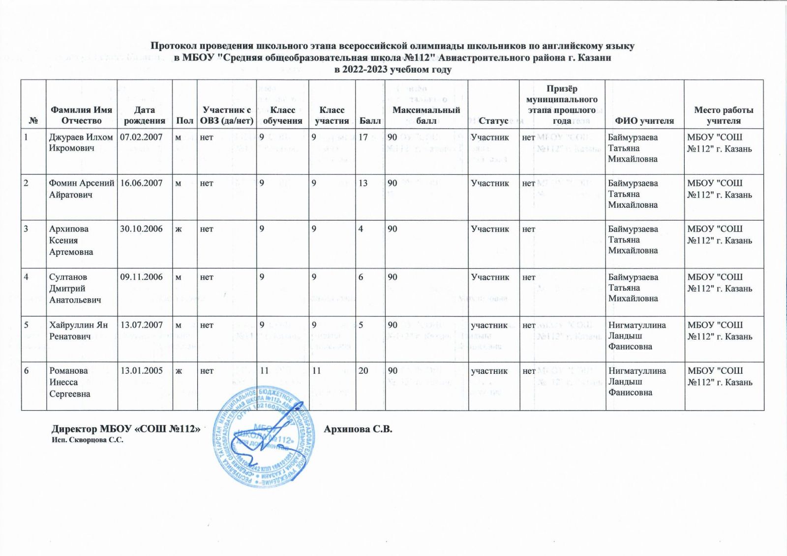 Протокол олимпиады по английскому языку