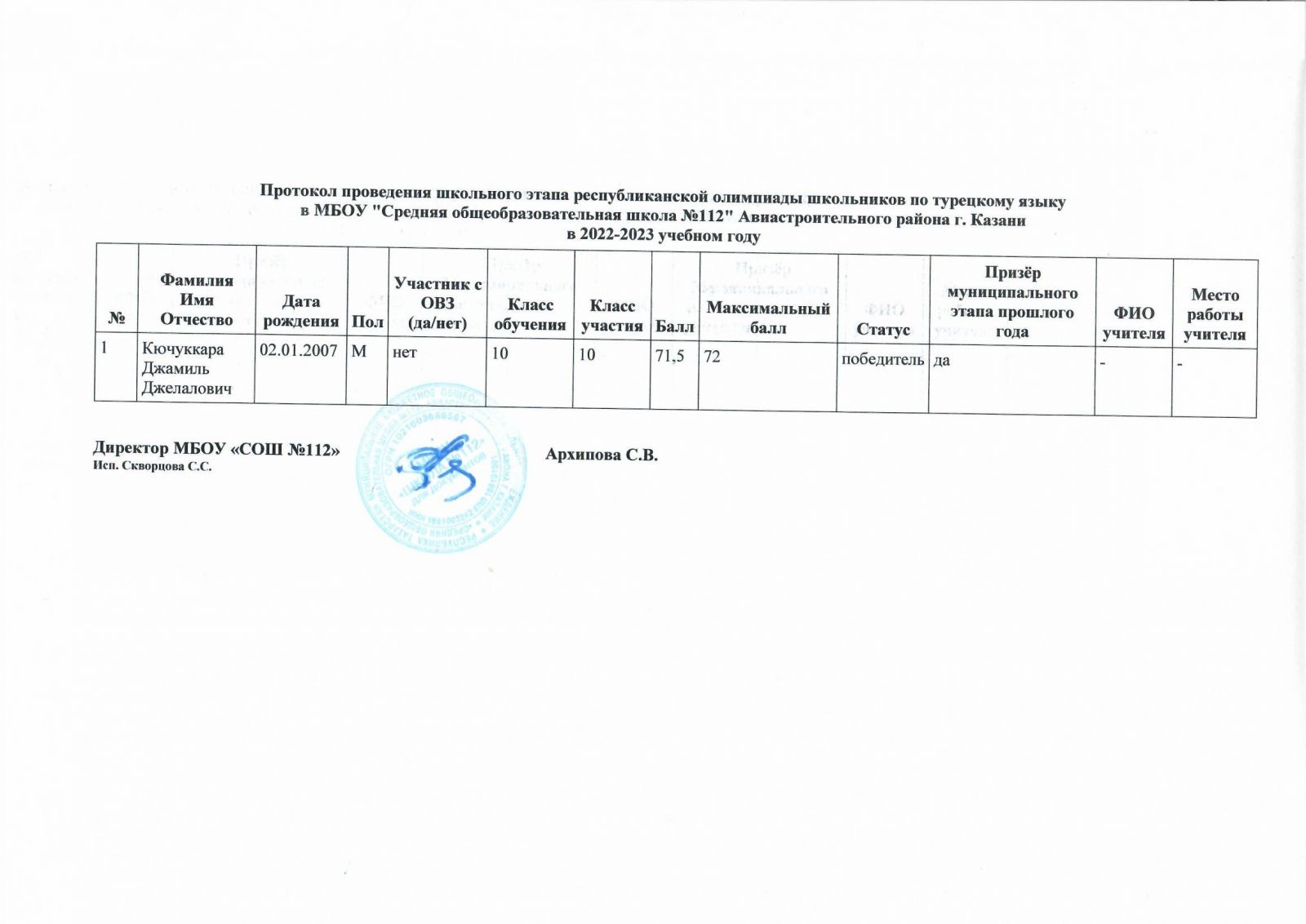 Протокол олимпиады по турецкому языку