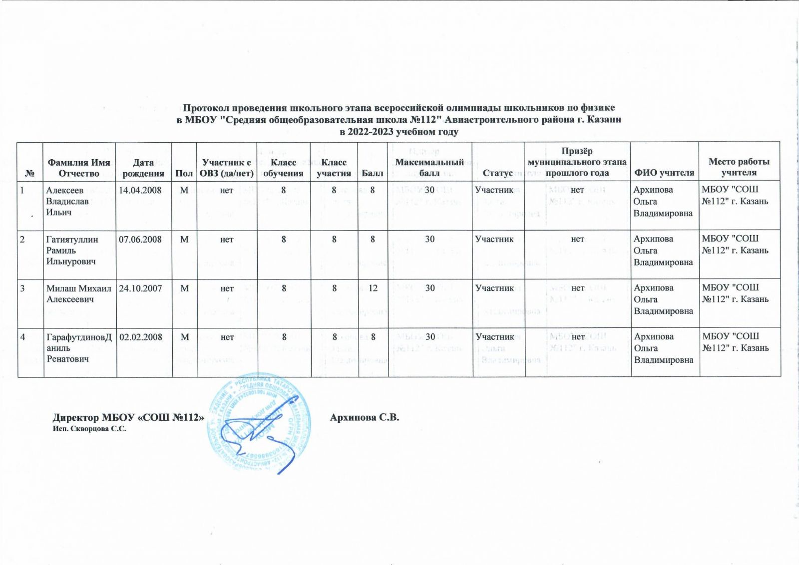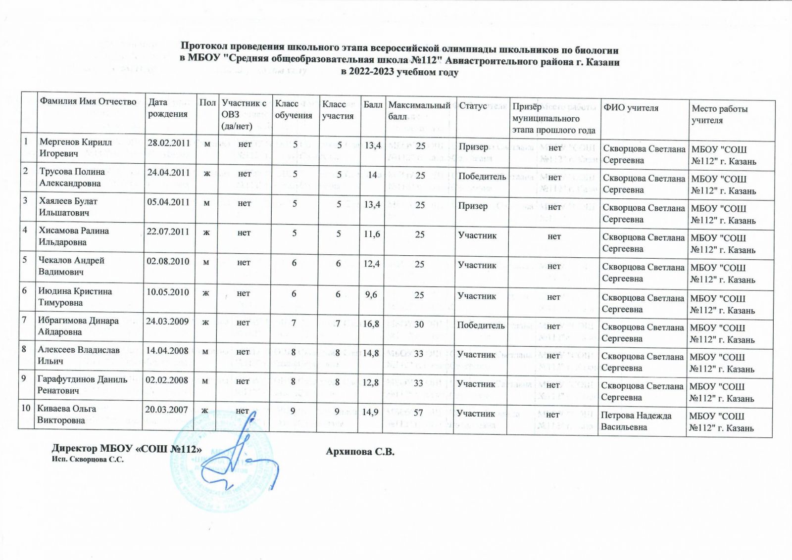 Протокол олимпиады по биологии