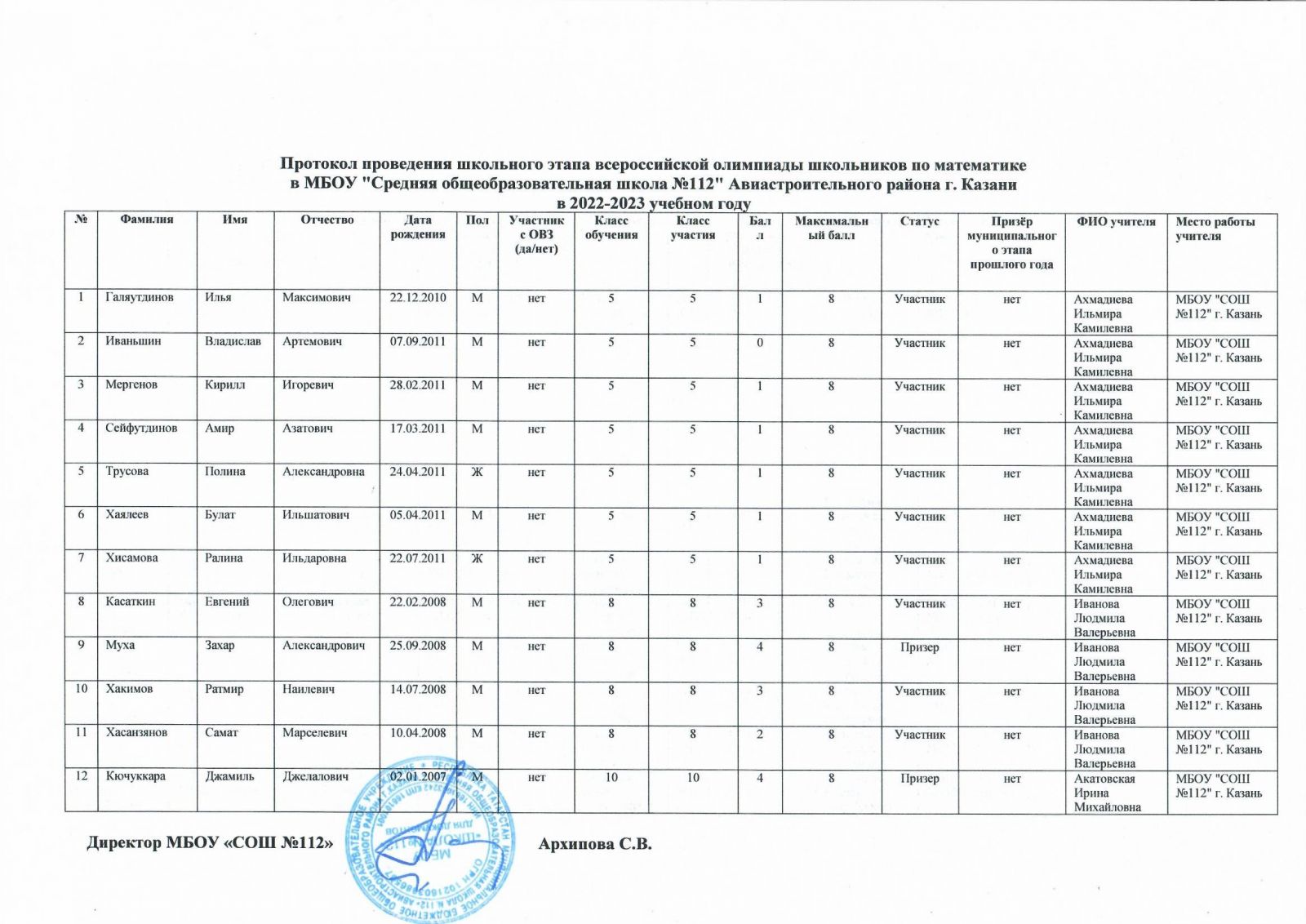 Протокол олимпиады по математике