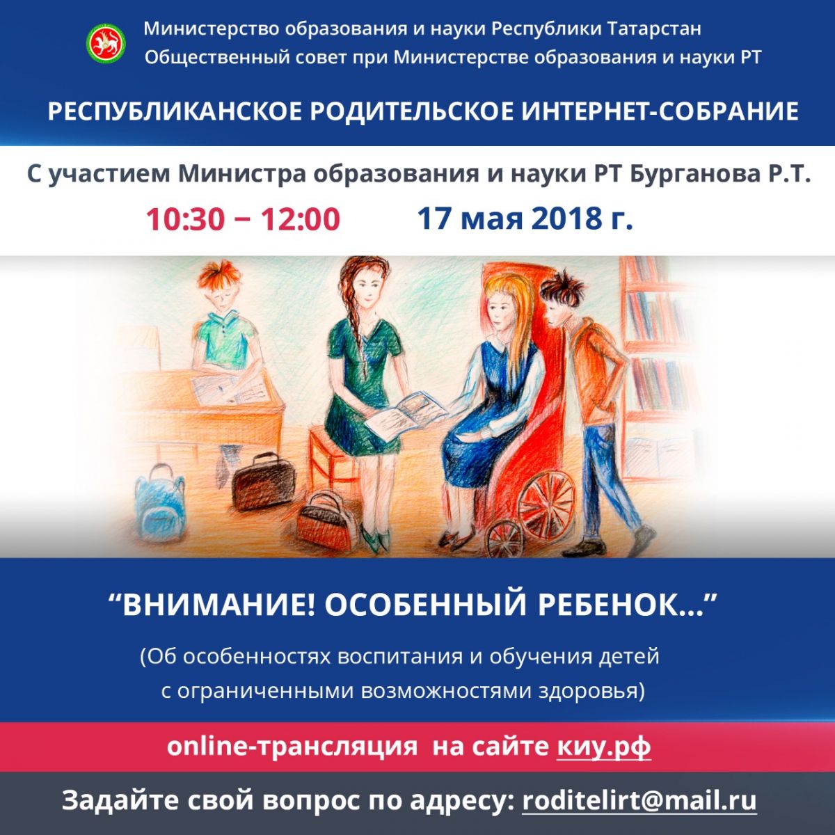 Опубликовано: 15.05.2018Республиканское родительское интернет-собрание с участием министра образования и науки РТ Бурганова Р.Т. состоится 17.05.2018г. с 10:00-12:00 на тему: «Внимание! Особенный ребенок….» Подробнее