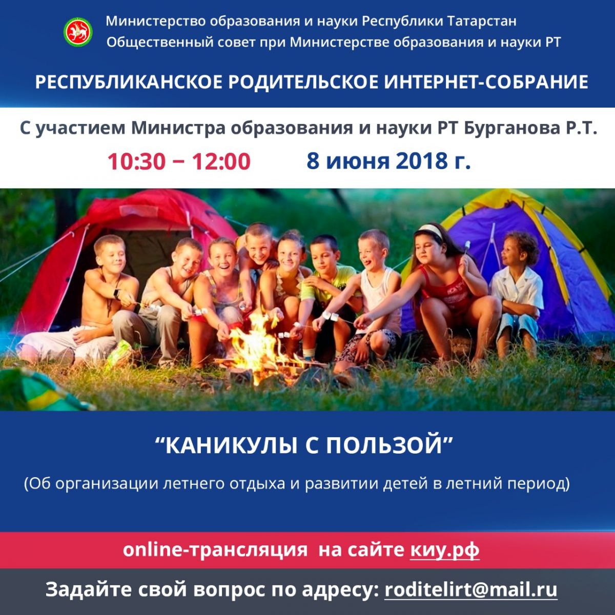 Опубликовано: 04.06.2018Республиканское родительское интернет-собрание с участием министра образования и науки РТ Бурганова Р.Т. состоится 08.06.2018г. с 10:00-12:00 на тему: «Каникулы с пользой! » Подробнее
