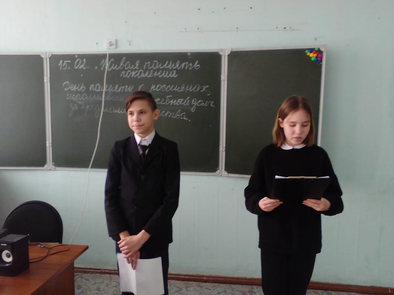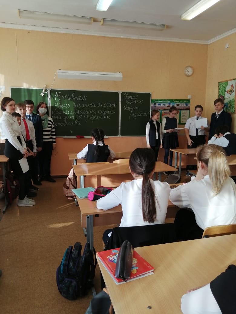 15 февраля в России отмечается День памяти россиян, исполнявших служебный долг за пределами Отечества (воинов-интернационалистов). День памяти позволил придать официальный статус мероприятиям, посвященным исполнению россиянами служебного долга за пределами Отечества, традиционно проводимым ветеранами войны в Афганистане 15 февраля (решение о выводе советских войск из Афганистана было принято в 1988 году, процесс начался 15 мая 1988 года, завершился 15 февраля 1989). Сегодня во всех классах нашей школы прошли мероприятия приуроченные этой памятной дате.