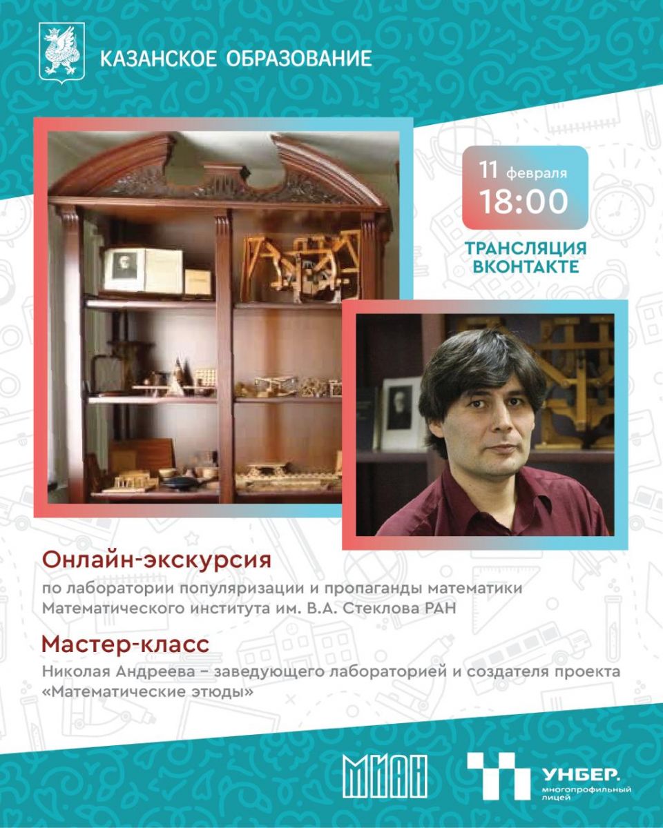 11 февраля 2021 года в 18.00 часов лаборатория популяризации и пропаганды математики Математического института им. В.А.Стеклова РАН совместно с Управлением образования г.Казани и МАОУ «Многопрофильный лицей №11» Советского района г.Казани, который в сентябре откроется в ЖК «Арт-сити», проводит уникальный мастер-класс для школьников и учителей.