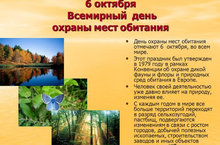 Сегодня в нашей школе пршли тематические классные часы посвященные Всемирному деню охраны мест обитаний, его отмечают Ежегодно 6 октября во всем мире-это международный праздник, призванный привлечь внимание человечества к проблеме сохранения среды обитания фауны планеты Земля. Этот праздник был учреждён в 1979 году в рамках Бернской конвенции о сохранении европейской дикой природы и естественной среды обитания.