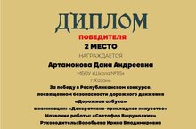 Поздравляем Артамонову Дану, ученицу 9а класса, занявшую 2 место в Республиканском конкурсе, посвящённом безопасности дорожного движения "Дорожная азбука". В номинации: "Декоративно-прикладное искусство". Название работы: "Светофор Выручалкин". Руководитель: Воробьёва И.В.
