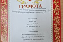 Поздравляем учениц нашей школы! Яшину Яну 3 А класс (кл.руководитель Загородских Е.М.), занявшую 1 место в районном этапе республиканского конкурса "В дружбе народов единство России", и Зарипову Самиру, ученицу 4 А класса (кл.руководитель Шакирова О.И.), занявшую 3 место. Желаем дальнейших побед и творческого роста!