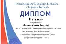 Поздравляем Ахмаматовву Камилу, ученицу 4 А класса (рук. Сергеева И.А.). Камила участвовала в Республиканском конкурсе-фестивале "Патриоты России" и награждена дипломом 2 степени в номинации "Патриотическая песня - Соло". Поздравляем!