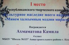 Поздравляем Ахмаматову Камилу, ученицу 4 А класса, занявшую 1-ое место в Республиканском творческом конкурсе "Культурное наследие моего народа" в номинации "Родные мелодии" (руководитель Сергеева Инна Александровна).