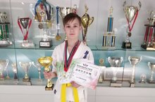 Ученик нашей школы выступив на соревновании, взял первое место, кубок Татарстана по Ката (комплекс боевых действий, составляющих технику атаки либо защиты против воображаемых противников)