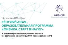 Мы рады сообщить о том, что открыт прием заявок на Сентябрьскую образовательную программу «Физика. Старт в науку» , которая пройдет с 1 по 24 сентября 2019 года на базе Образовательного центра «Сириус» (г. Сочи).