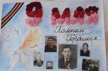 В преддверии Великого праздника ученики 1 "Б" класса своими руками создали плакат "9 мая". Фотографии близких, воевавших за Родину , подаривших нам Мирное небо над головой, разместились на странице памяти. "Помним.. Гордимся.."