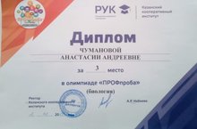 Поздравляем ученицу 9 класса Чуманову Настю, занявшую 3 место в олимпиаде «ПРОФпроба» (биология). Администрация школы выражает благодарность учителю биологии Шишовой Э.Р., подготовившей призера.