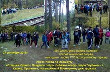 Информацияпо проведению учебного семинара учащихся и педагогов общеобразовательных школ и ЦВР Авиастроительного района с совершением кросс - похода по маршруту «Станция Юдино - Лазурное озеро -Лебяжье озеро - озеро Глубокое - г. Казань, Оргсинтез, посвящённому Всемирному дню туризма.Согласно положения и Приказа Управления образования ИКМО г. Казани по Авиастроительному и Ново-Савиновскому районам и Приказу ЦВР № 279 от 13.09.16г. 27 сентября 2016г. был проведен учебный семинар и кросс-поход, посвящённому Всемирному дню туризма с присвоения участникам кросс- похода третьего юношеского разряда и сдачи ими норм ГТО. -