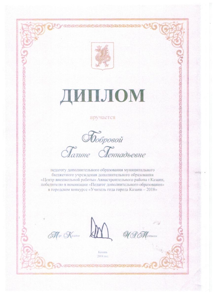 - Почетная грамота Управления образования Исполнительного комитета г. Казани за большой вклад в развитие дополнительного образования г. Казани, приказ от 10.06.2016 №431