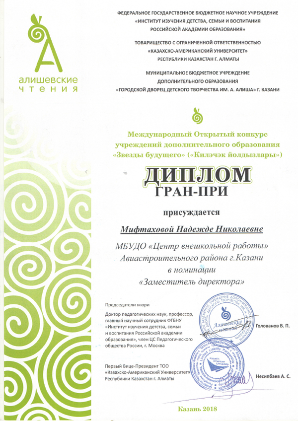 - Благодарственное письмо Министерства образования и науки Российской Федерации, международной кафедры-сети ЮНЕСКО, Федерации космонавтики России, Федерального Центра технического творчества учащихся , Творческого Союза художников России за личное участие в подготовке и поддержке команды Республики Татарстан в рамках 18-й Всероссийской Олимпиады «Созвездие-2017»