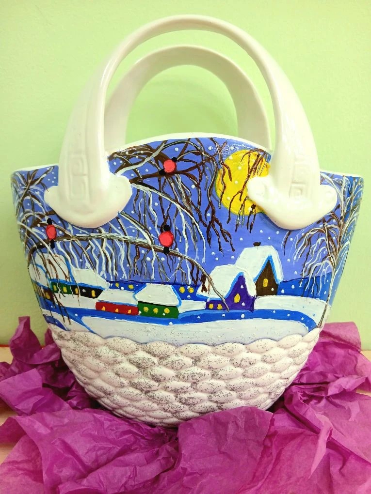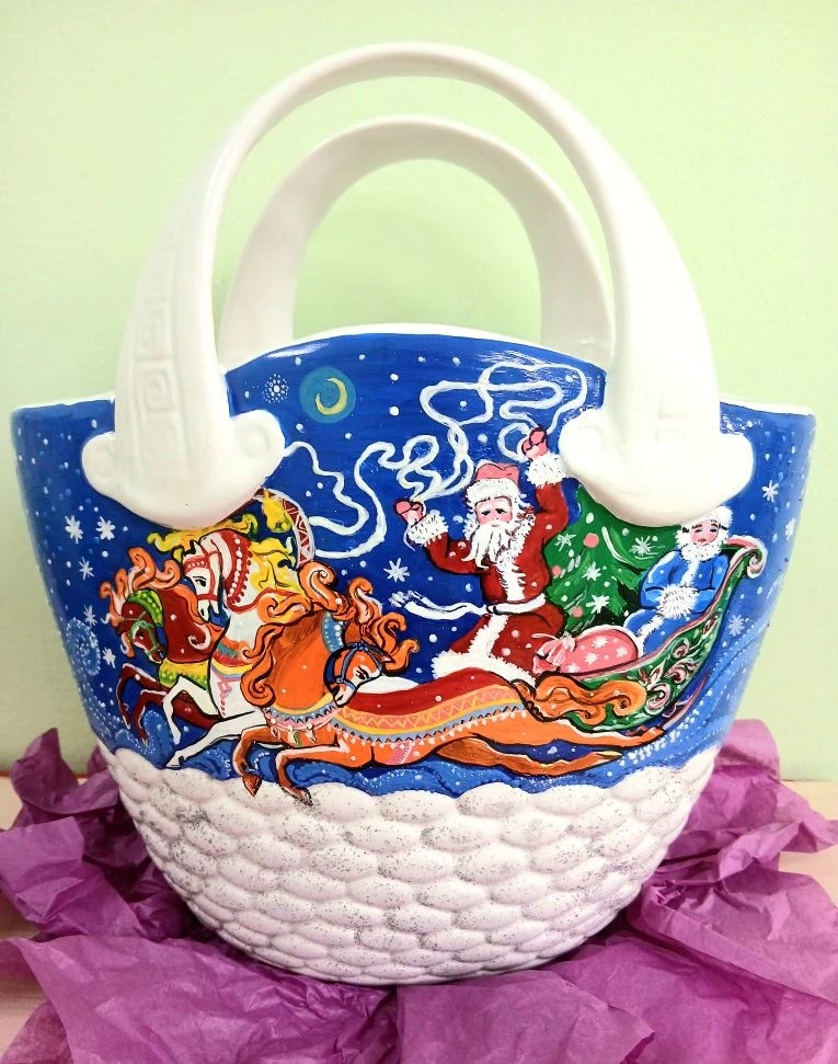 Наша ваза «Тройка лошадей» выполнена в технике роспись по керамике по тематике советских новогодних открыток 1987 года.