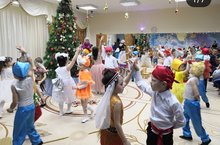 Завершило череду новогодних утренников в нашем детском саду-сказочное путешествие детей старших групп по странам Мира, в которые они отправились на ковре-самолете вместе со Снегурочкой и Стариком Хотабычем. Детей и зрителей встречали песнями и танцами в стране восходящего солнца, прериях, жаркой Аргентине и северных льдах. Но глпавный волшебник-Дедушка Мороз ждал ребят в России.
