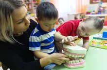Сегодня группу для "Солнечных детей" посетили специалисты кафедры стоматологии детского возраста КГМУ: Сафина Р.М., доцент и заведующая кафедры; Татимова Н.Ю. и Бардасова Ю.В., ординаторы кафедры. А также Шайдуллина Э.С. медицинский представитель компании LAKALUT. Тема встречи "Профилактика заболеваний твердых тканей зубов. Обучение гигиене полости рта". Ребятам понравился наглядный материал в виде большой челюсти, они с удовольствием рассматривали макет, учились правильно чистить зубы. Всем участникам раздали подарки от спонсора.