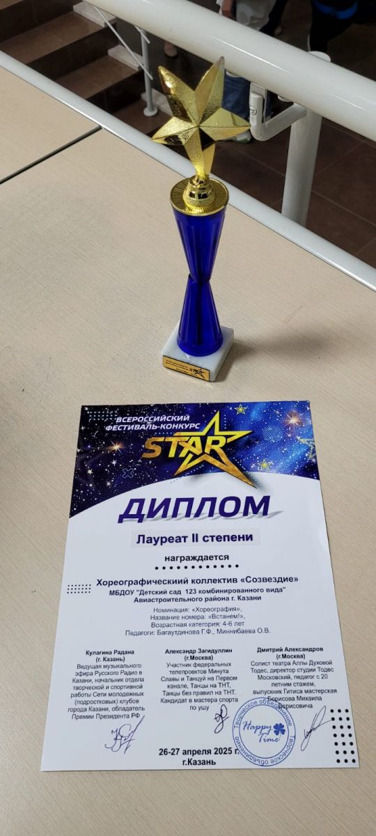 Наша 4 старшая группа под руководством музыкального руководителя Багаутдиновой Гузель Фаритовны стали лауреатами 2степени на Всероссийском фестивале-конкурсе "STAR" и лауреатами 1 степени на Международном конкурсе "ПОКОЛЕНИЕ - 2025" с партиотическим танцем "Встанем!"