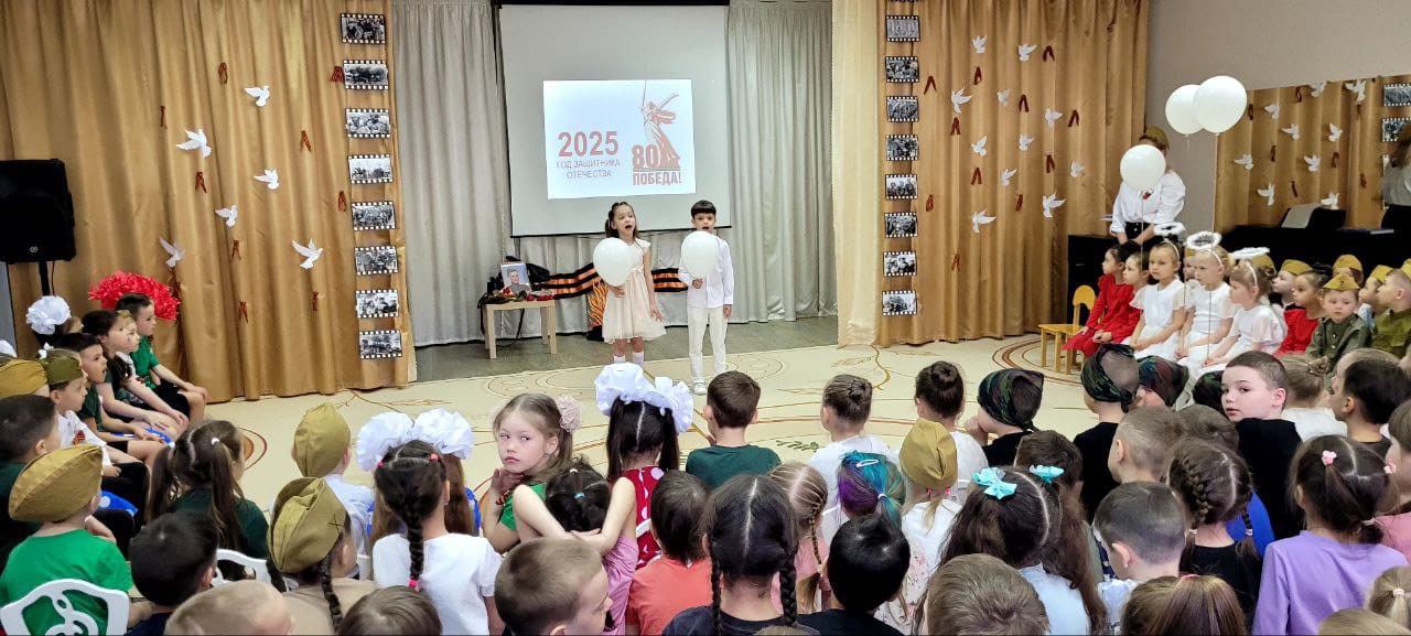 Накануне 9 мая в детском саду прошл праздник для средних, старших и подготовительных групп, посвященный дню Великой Победы. Праздник был подготовлен с целью формирования у детей знаний о Великой Отечественной войне, обогащения знаний дошкольников об истории своей страны, воспитания чувства гордости за героизм нашего народа, воспитания устойчивого интереса к армии. В программу мероприятия вошли песни о празднике победы, о мире, о солдатах, танцы, стихи о войне, о бессмертном подвиге защитников Отечества.