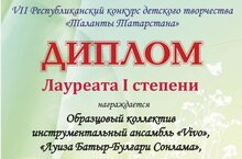 IIV Республиканский конкурс детского творчества "Таланты Татарстана" состоялся в Казани. В конкурсе приняли участие ученицы скрипичного отдела Сиразутдинова Ясмина, Гимранова Малика, а так же образцовый инструментальный ансамбль "Vivo" (рук.: Абросимова И.В.).