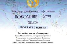 Международный конкурс-фестиваль ПОКОЛЕНИЕ-2023 состоялся в Казани 22 апреля. В конкурсе принял участие Ансамбль танца «Виктория» под руководством Мухтаровой Р.Ч., концертмейстер: Чекмарева Ф.Э.