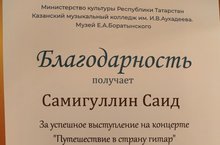 Самигуллин Саид, ученик 4 класса отделения народных инструментов выступил на городском концерте "Путешествие в страну гитар". Преподаватель Комарова Юлия Владимировна.