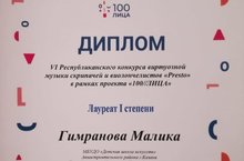 Учащаяся отделения скрипки Гимранова Малика (преп. Ирина Валериановна А., конц. Варвара Васильевна Б.) участвовала в Республиканском конкурсе виртуозной музыки скрипачей и виолочелистов "Presto" и стала Лауреатом 1 степени. Поздравляем! Дальнейших побед!