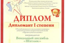 1 Республиканский молодежный конкурс комсомолькой и патриотической песни "Орлята учатся летать" состоялся в Казани с 24 по 26 октября 2018г. В номинации конкурса "Вокальные ансамбли"(12-15 лет) принял участие Вокальный ансамбль "Шатлык" под руководством Шараповой Л.Д. Ансамбль награжден дипломом Дипломанта 1 степени.