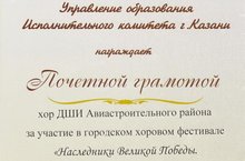 Поведены итоги Городского хорового фестиваля " Наследники Великой Победы. Поют дети Казани", посвященном 71-летию Победы в ВОВ. Почётной грамотой Управления образования Исполнительного комитета г. Казани награждены преподаватели и обучающиеся нашей школы: