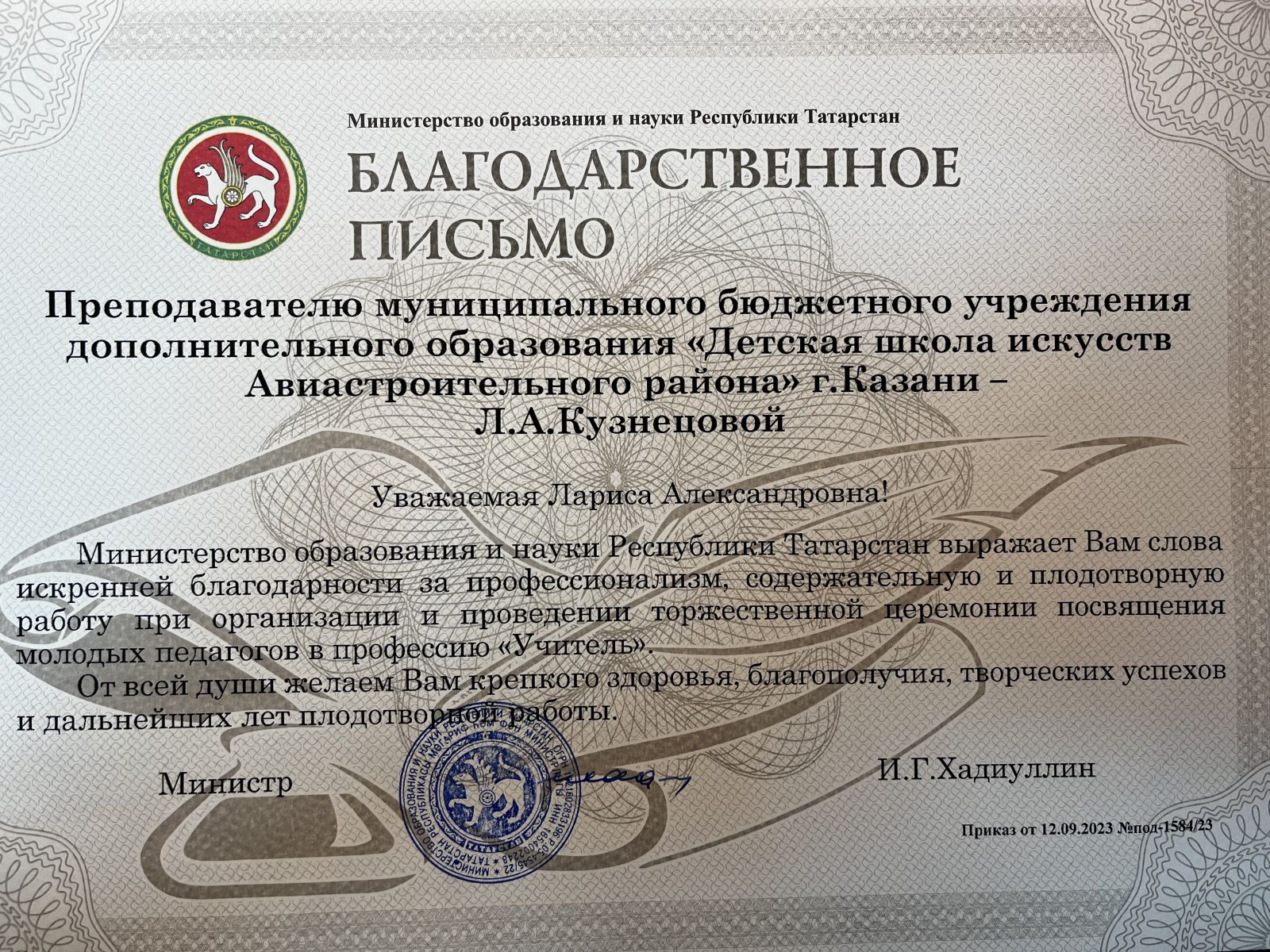 2.  Участие в организации и проведении торжественной церемонии посвящения молодых педагогов в профессию "Учитель" Кузнецова Л.А.;