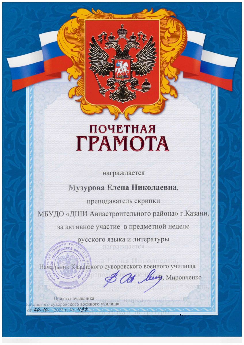 3. Участие в предметной неделе русского языка и литературы Казанского суворовского учищища Музурова Е.Н.;