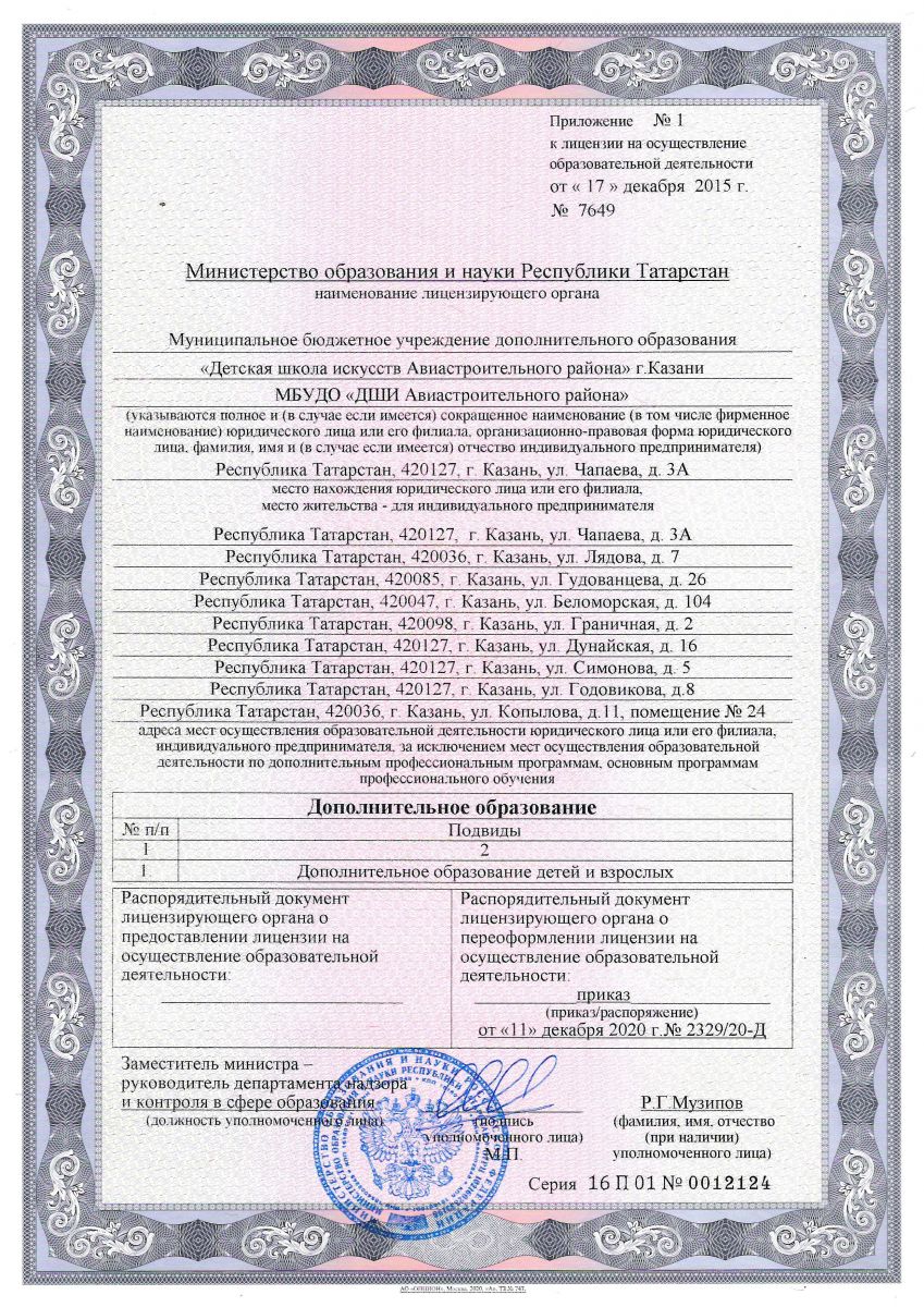 ЛИЦЕНЗИЯ на осуществление образовательной деятельности ДШИ Авиастроительного района г. Казани.