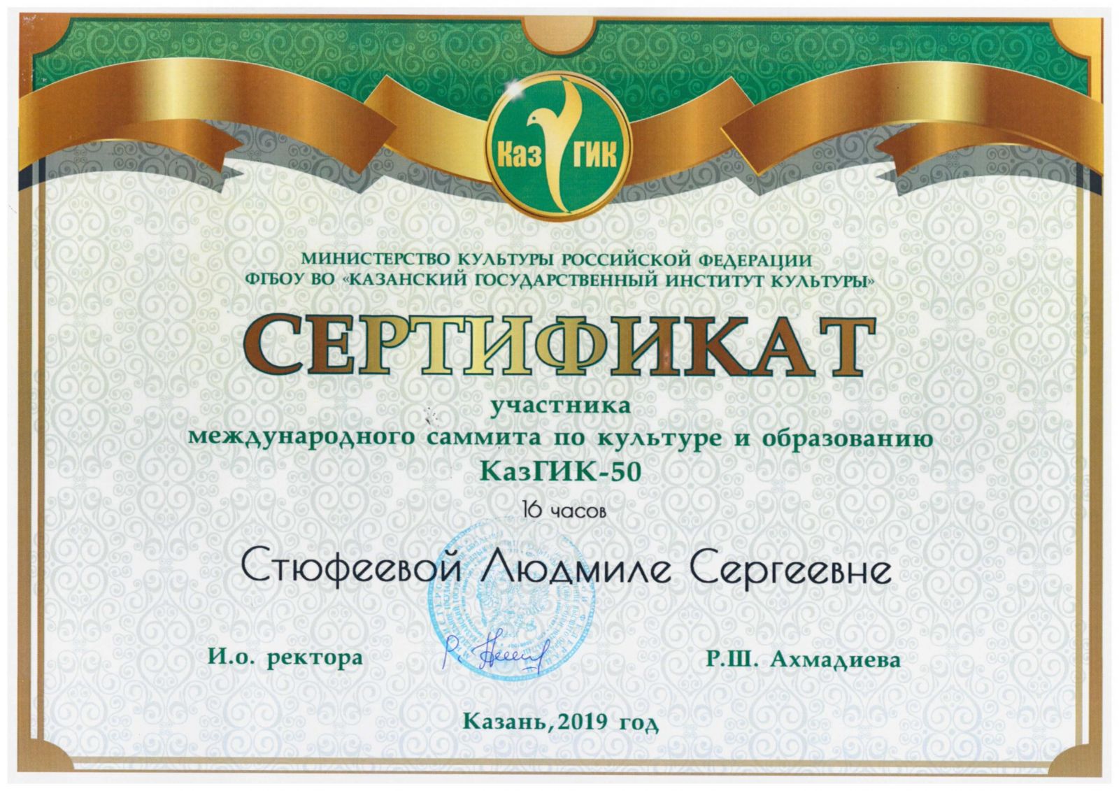 1. Международный саммит по культуре и образованию КазГИК-50, Сертификат