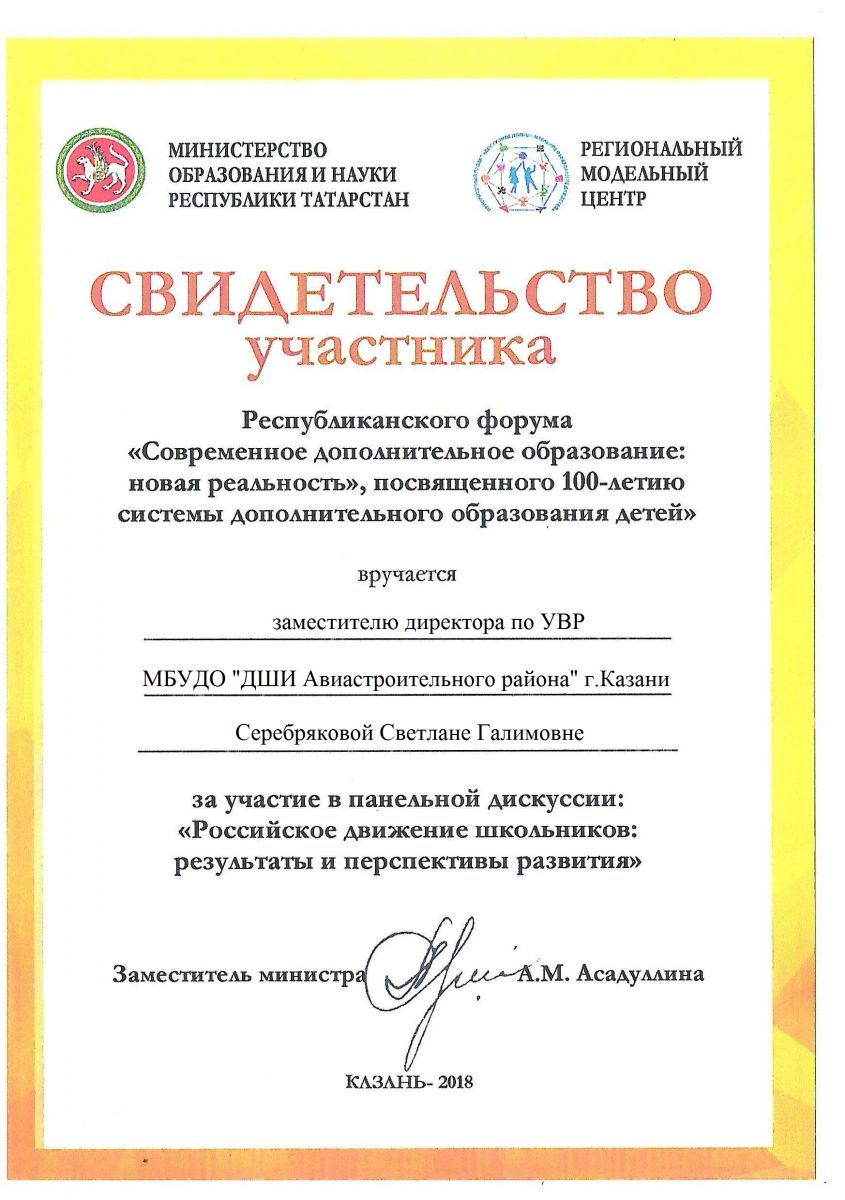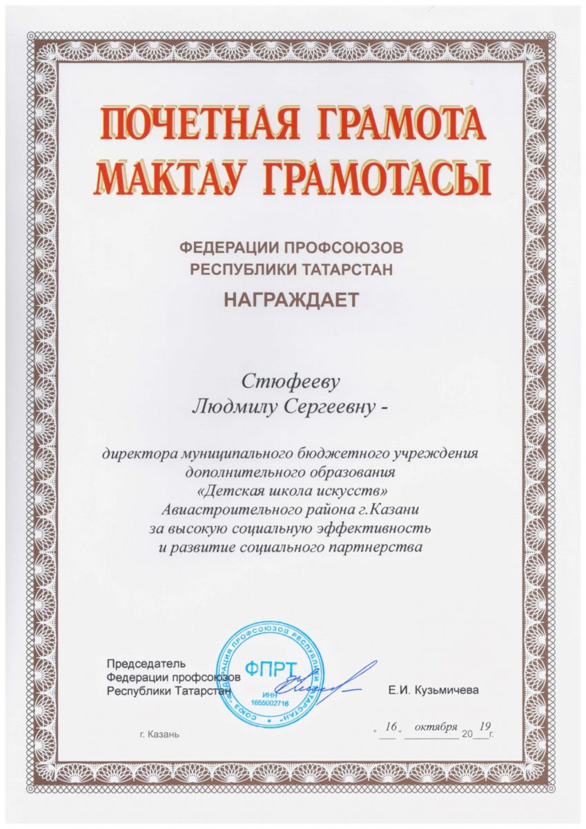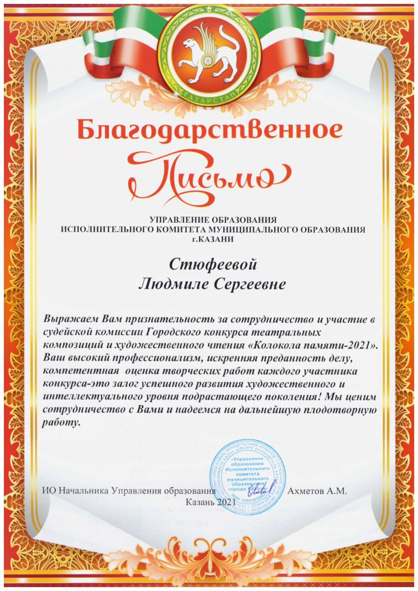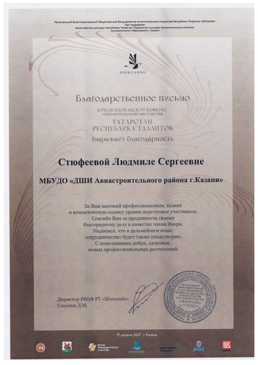 5. 2 Республиканский конкурс "Татарстан. Республика Талантов", Благодарственное письмо за высокий уровень профессионализма и компетентную оценку уровня подготовки участников.