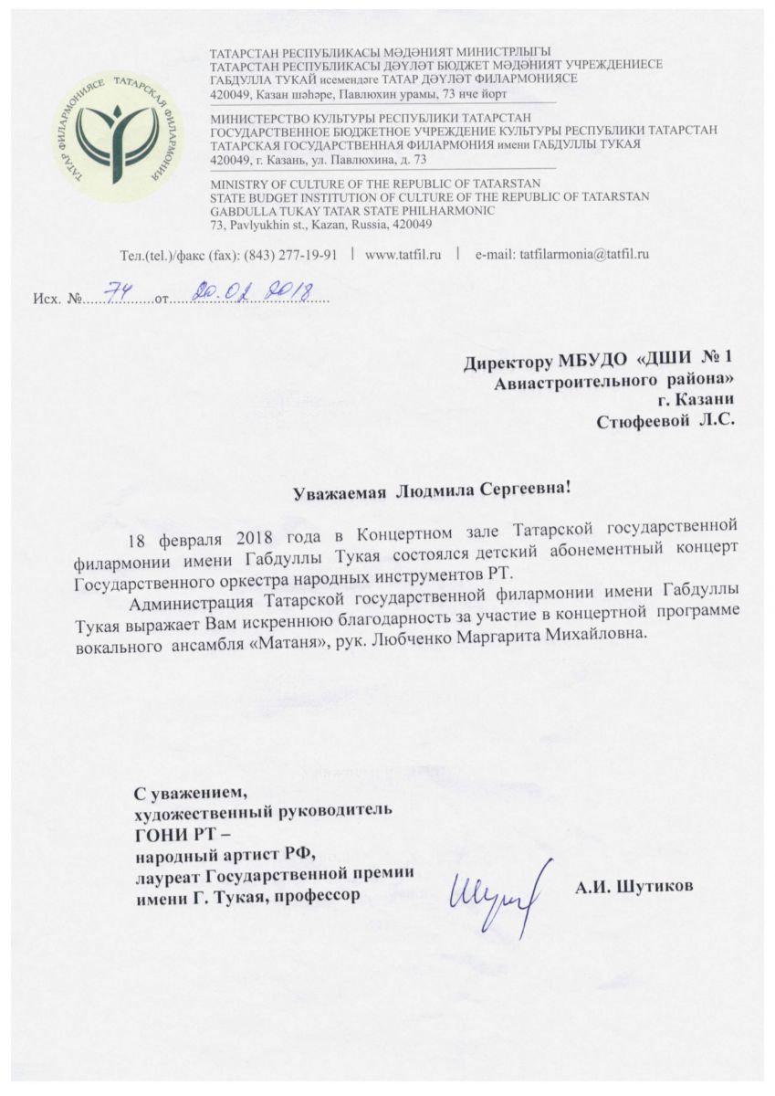 5. Благодарственное письмо художественного руководителя ГОНИ РТ - народного артиста РФ, А.И. Шутикова
