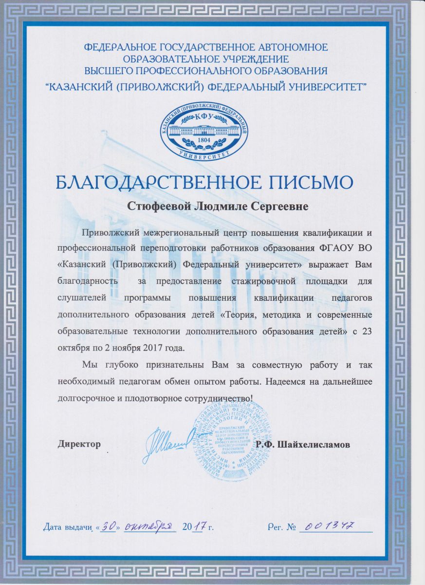 1. БЛАГОДАРСТВЕННОЕ ПИСЬМО поволжского межрегинального центра повышения квалификации и профессиональной переподготовки работников образования ФГАОУ ВО "КФУ" за предоставление стажировочной площадки для слушателей программы повышения квалификации педагогов ДОД "Теория, методика и современные образовательные технологии ДОД" 30.10.2017