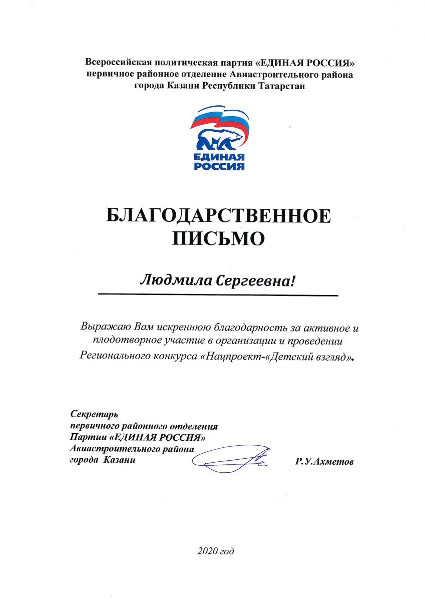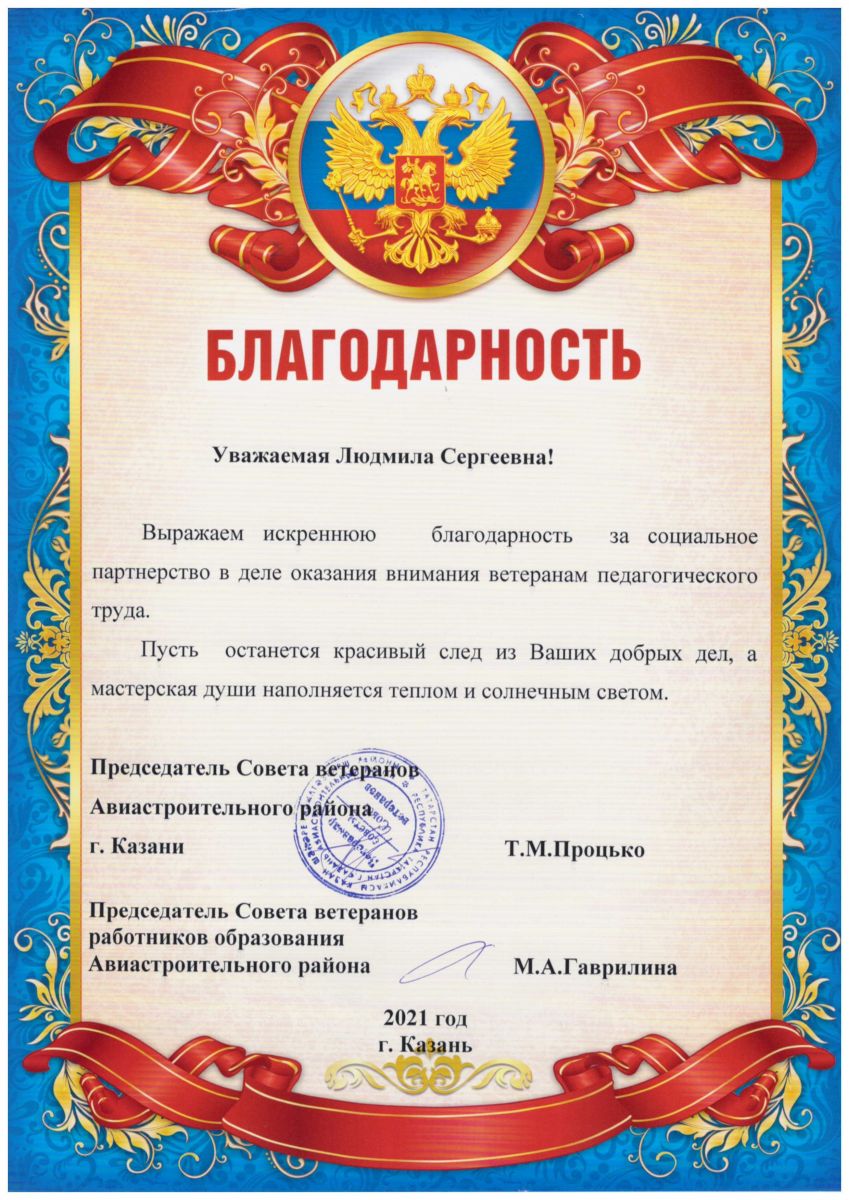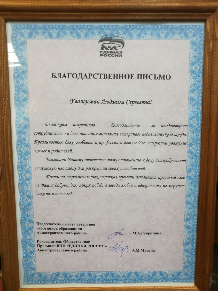 3. Благодаственное письмо Руководителя общественной приемной ВПП ""Единая Россия" А.М. Мусиной, Председателя совета ветеранов работников образования Авиастротельного района М.А. Гаврилиной