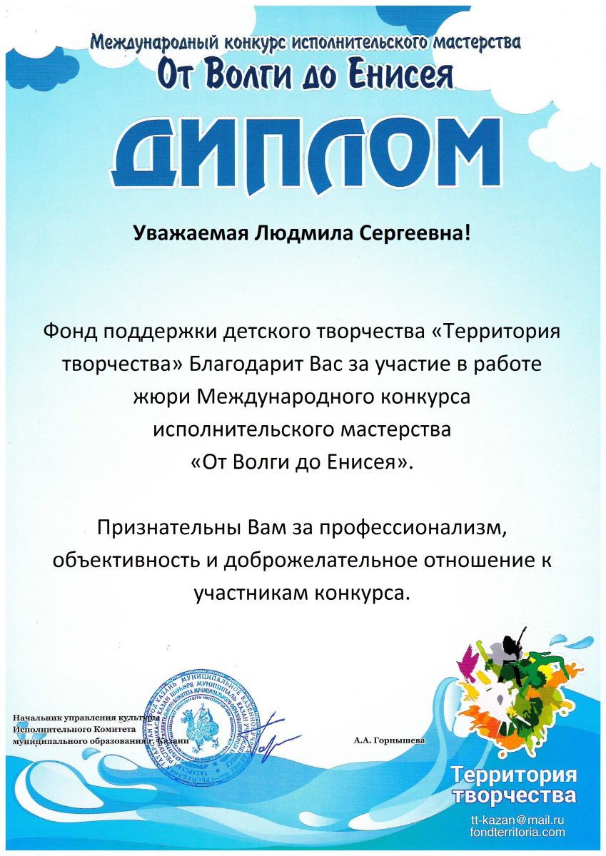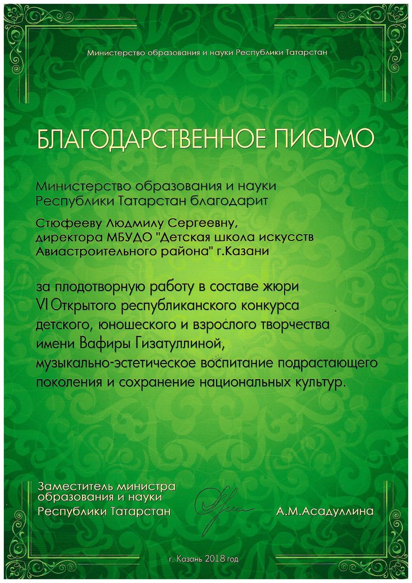 7. VII Открытый республиканский конкурс детского, юношевского и взрослого творчества имени Вафиры Гизатуллиной, Благодарственное письмо за работу в жюри.
