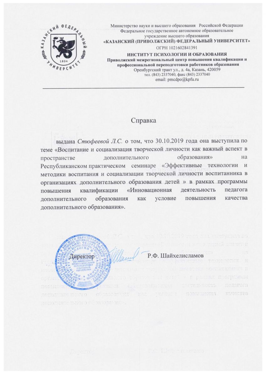 4. Семинар-практикум «Эффективные технологии и методики воспитания и социализации творческой личности воспитанника в организациях дополнительного образования детей» 30 октября 2019 года, доклад, справка.