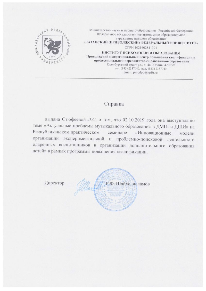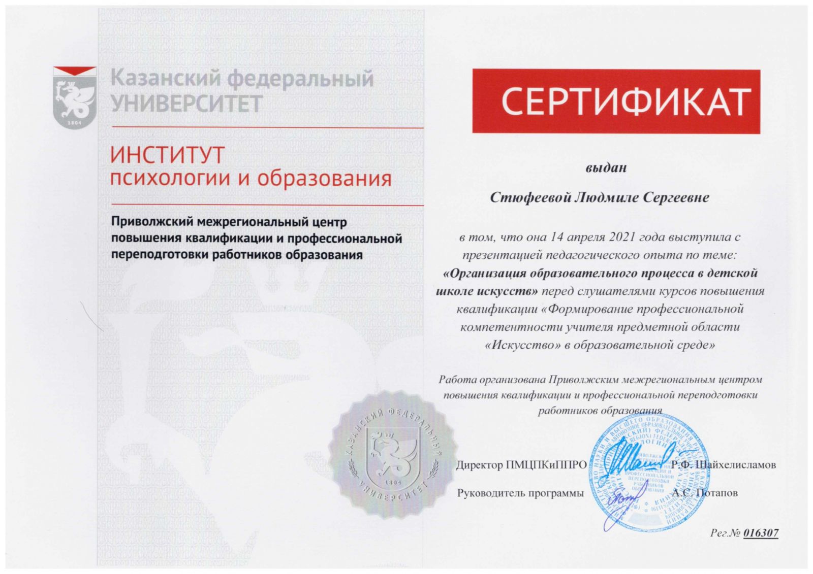 4. Выступление с презентацией педагогического опыта по теме: "Организация образовательного процесса в детской школе искусств", КФУ, 14 апреля 2021 г., Сертификат